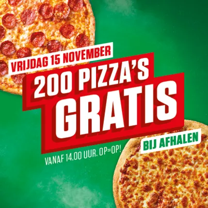 Kom op vrijdag 15 november tussen 14:00 en 16:00uur naar de winkel toe en kom deze gratis pizza bemachtigen! Kom wel op tijd want OP=OP en dat zou toch zonde zijn. Bon Apetite!